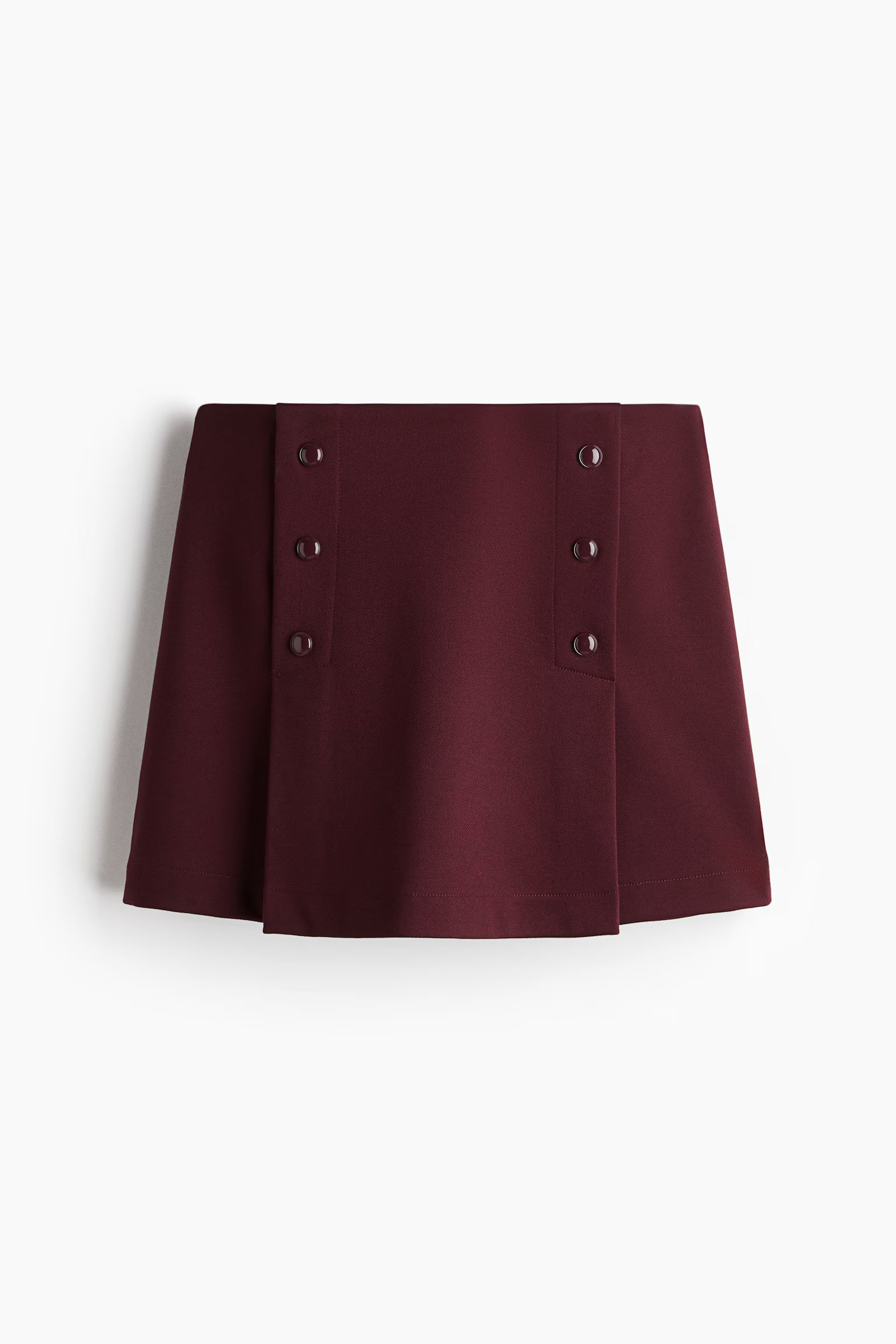 Short skort in heavy jersey featuring a high waist with concealed elastication. Pleats and decorative buttons at the front.